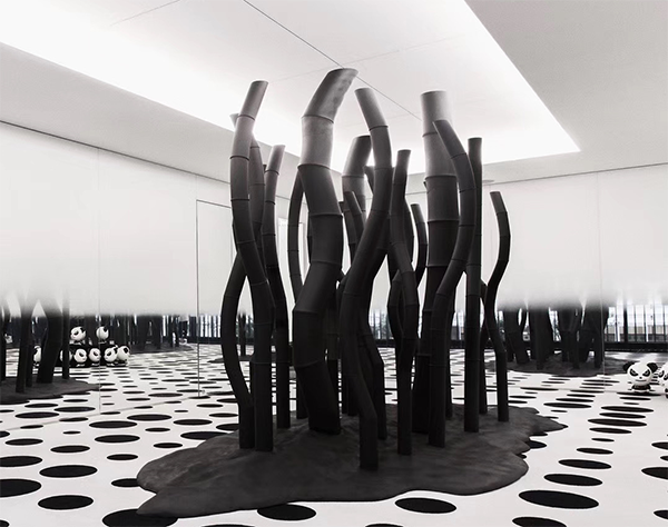 产品的设计灵感:产品起初的设计灵是跳跃与碰撞,黑色波点的镜面空间与生长于山野间的竹子,高山流水的底座相呼应,符合客户日本旗舰店展示的主题。
