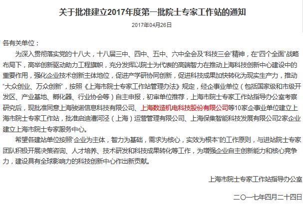 上海市科学技术协会院士专家工作站指导办公室发布《关于批准建立2017年度第一批院士专家工作站的通知》,宣布上海888集团机电科技股份有限公司(以下简称“888集团科技”)获批建立院士专家工作站,宣告沪上首家3D打印院士工作站正式建站。