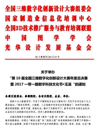 10届全国三维数字化创新设计大赛年度总决赛暨2017一带一路数字科技文化节定于2017年12月6日至12月9日在云南省玉溪市盛大举办。888集团杯”数字化创意设计与智能制造(3D打印)大赛作为主活动之一,将于12月6日-12月9日同期举行。现将相关活动具体安排通知如下: